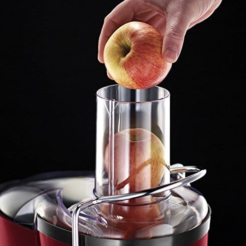 Der Russell Hobbs Entsafter hat eine Einfüllöffnung mit einem Durchmesser von 75 mm. Diese erlaubt die Verarbeitung von ganzen Früchten. Um harte oder weiche Obst- und Gemüsesorten optimal verarbeiten zu können, ist der Russell Hobbs Entsafter mit zwei Geschwindigkeitsstufen ausgestattet. Dabei werden Früchte mit einem höheren Härtegrad auf der schnellen und weiche Früchte auf der langsamen Stufe verarbeitet.
